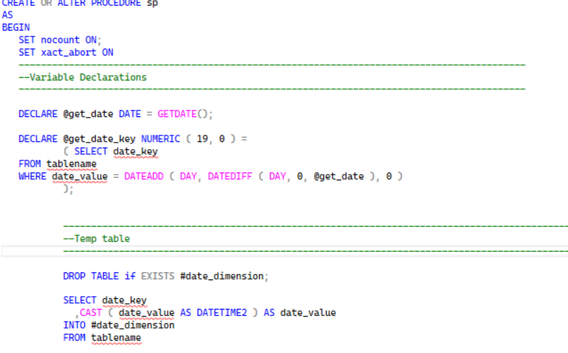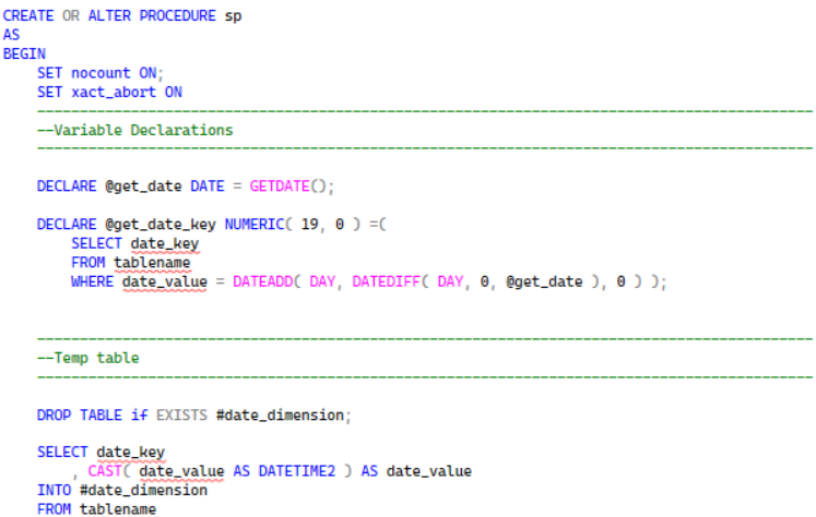 I am using the same settings I was in SSMS18 but in 21 when I have variable declaration at the top and format the entire code it does 2 indentations for everything below it (1 indentation is expected after the BEGIN the other is undesired). I tried different settings but nothing changes this and it is very problematic because any formatted code with variables becomes unappealing. Another issue in this example that I am unsure how to fix is how the from and where in the subquery for @get_date_key do not align with SELECT.